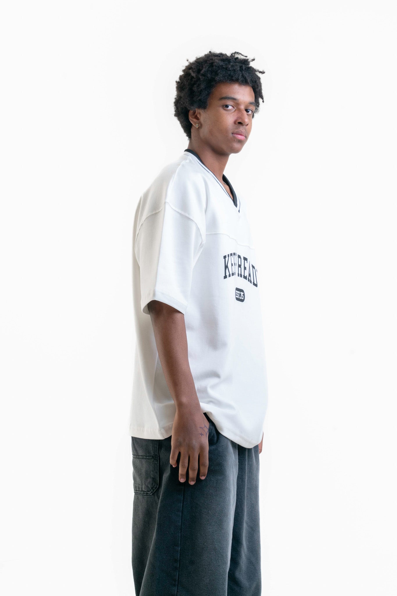 Özellik: Göğüs kısmında "KEEP READY" ve "EST.75" yazılı baskı, V yaka siyah çizgi detayı