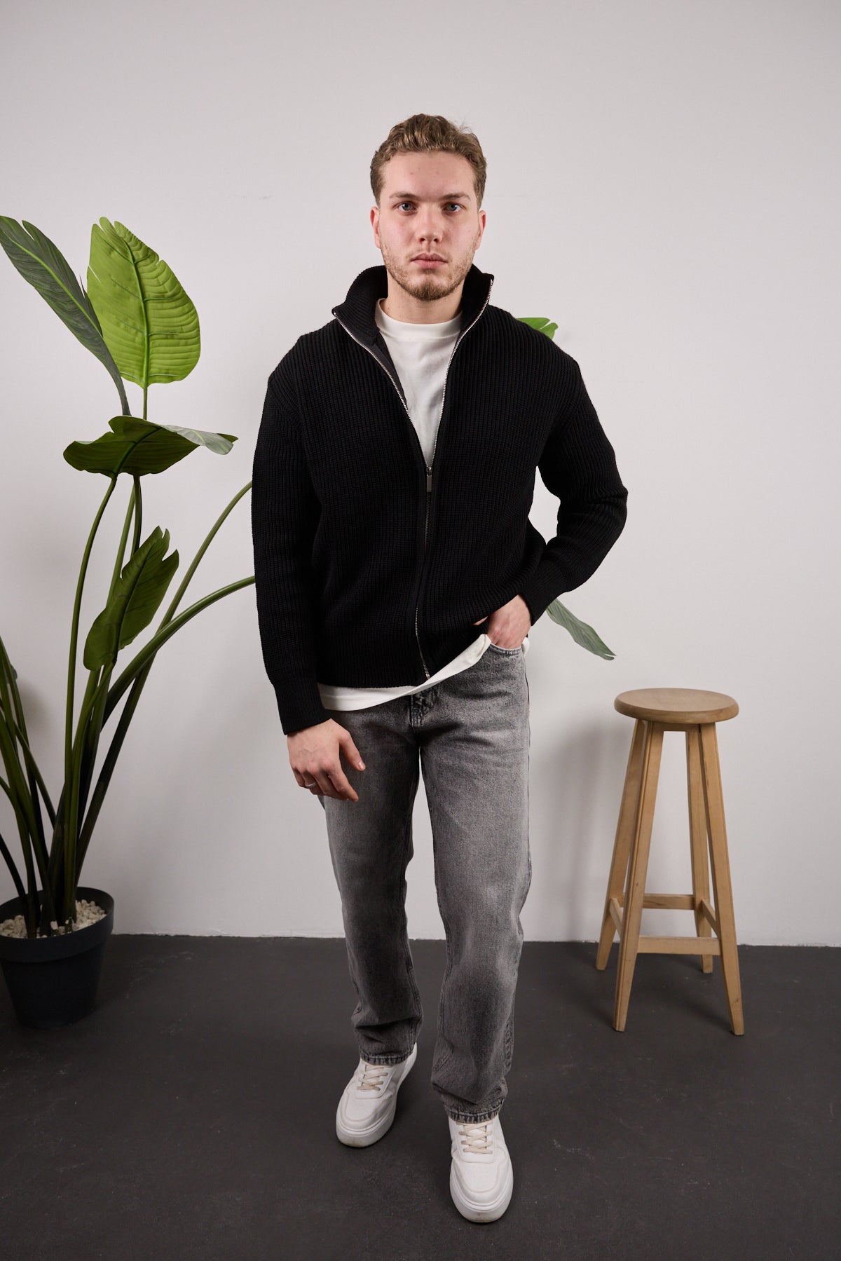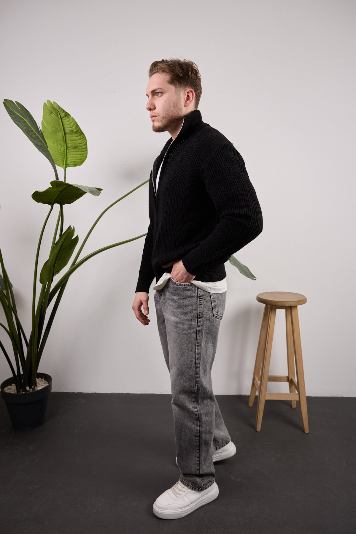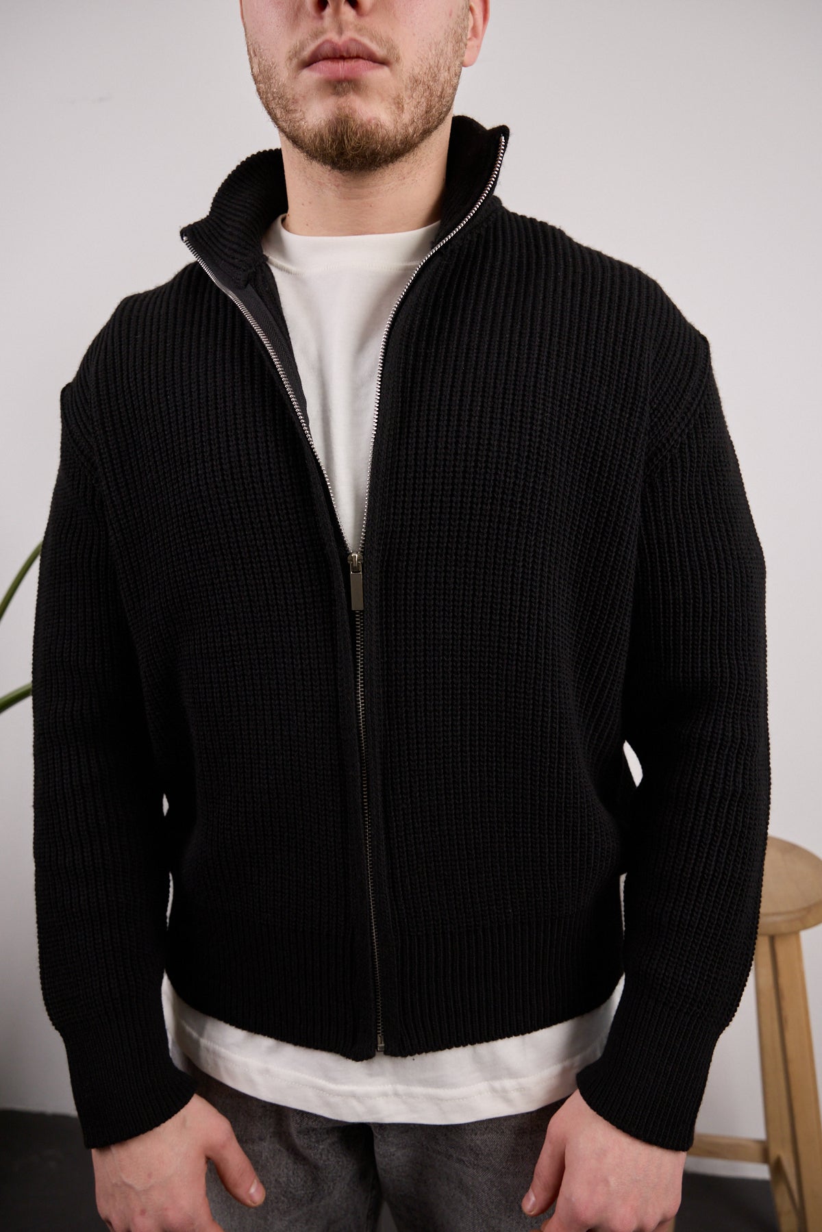 Tam fermuarlı triko kazak Siyah