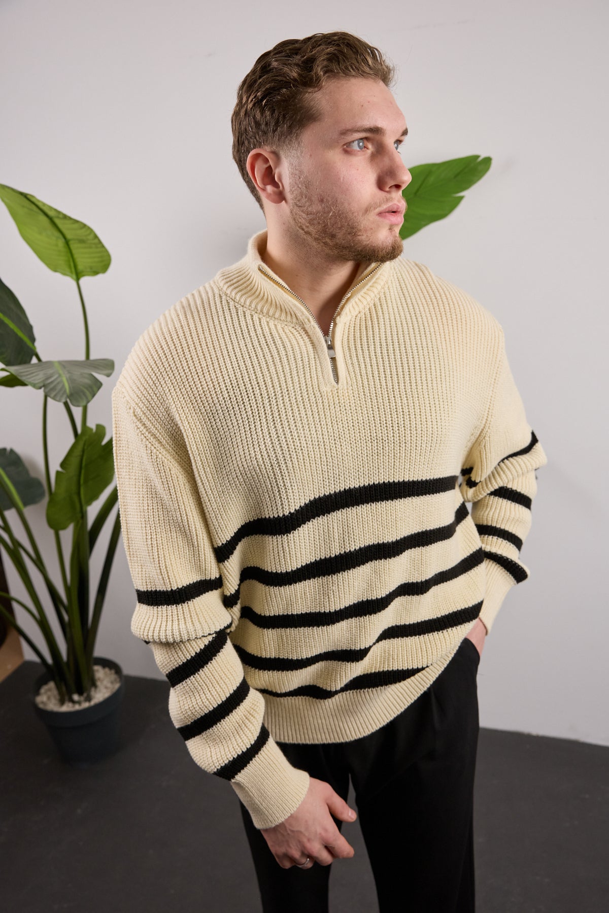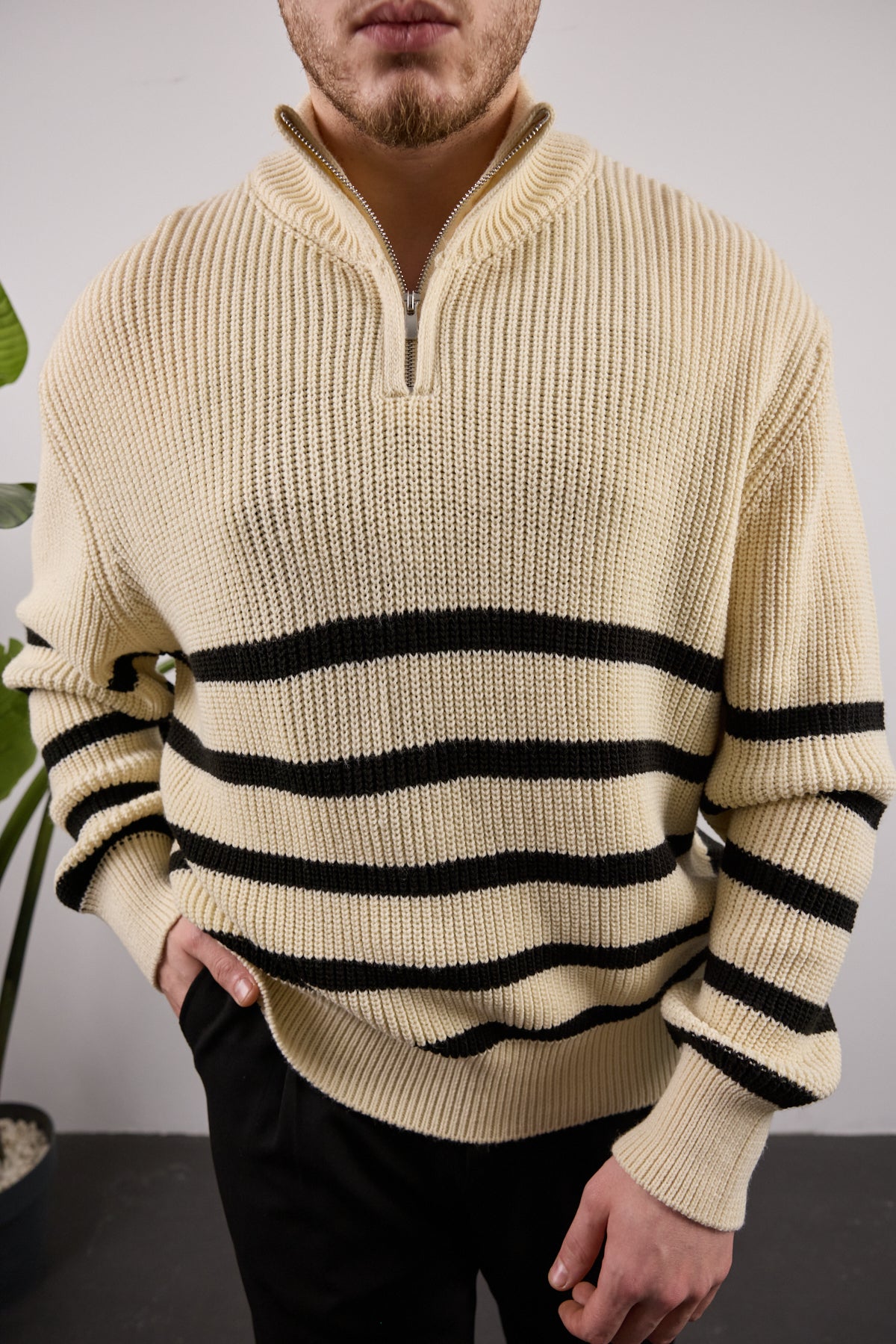 Kalıp: Oversize kesim kazakÖzellik: Ön kısmında fermuar ve siyah çizgiler Kumaş: Triko